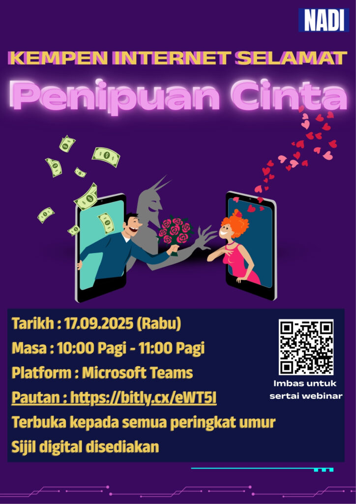 Dengan segala hormatnya, pihak kami ingin menjemput penyertaan ke Webinar Kempen Internet Selamat yang akan diadakan pada 17 September 2025 (Rabu) secara dalam talian melalui Microsoft Teams. Maklumat webinar adalah seperti berikut :