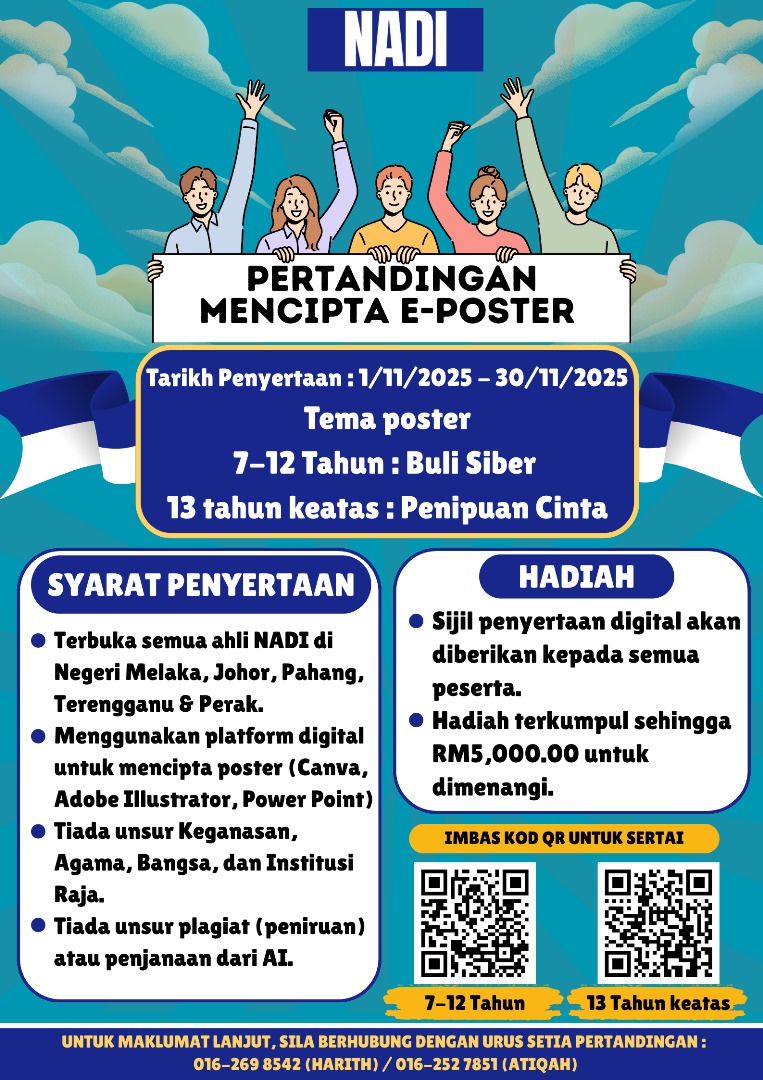 Jom sertai Pertandingan Mencipta E-Poster NADI yang akan berlangsung dari 1 hingga 30 November 2025! π Tema Poster:π¦π§ 7β12 Tahun: Buli Siberπ§π© 13 Tahun ke atas: Penipuan Cinta π Syarat Penyertaan:β Terbuka kepada semua ahli NADI di Melaka, Johor, Pahang, […]