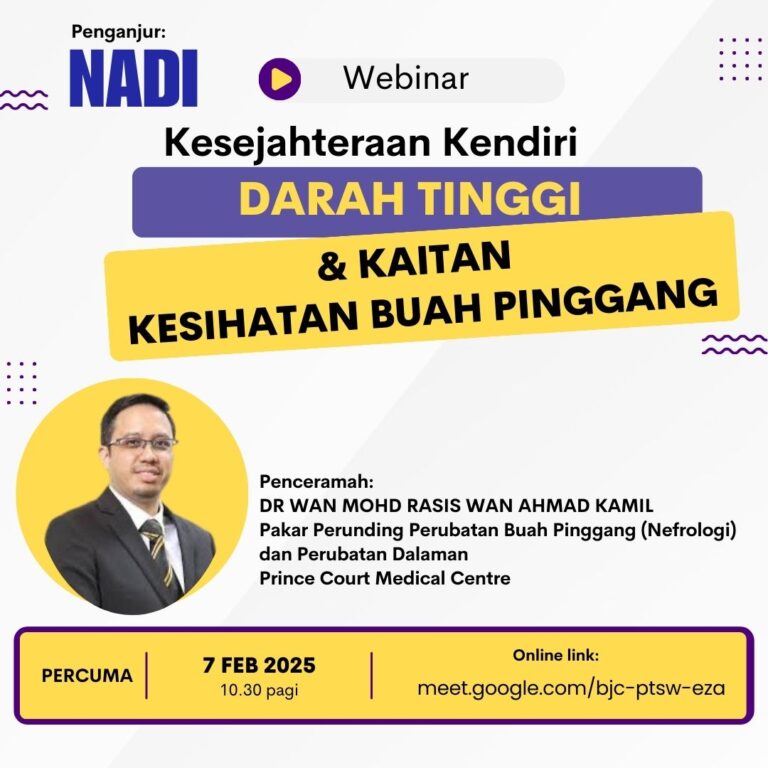 Adakah darah tinggi menyebabkan penyakit buah pinggang, atau penyakit buah pinggang yang mencetuskan darah tinggi? Sertai Webinar NADI Kesejahteraan Kendiri, Bersama-sama dengan Dr Wan Mohd Rasis Wan Ahmad Kamil , Pakar Perunding Perubatan Buah Pinggang (Nefrologi) dan Perubatan Dalaman dari Prince Court Medical Center, dalam perbincangan menarik mengenai: