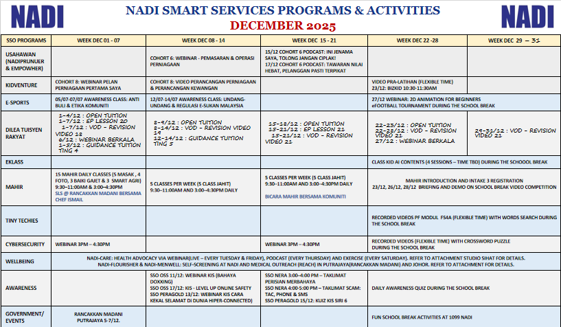 Jadual Smart Services bagi bulan Disember 2025